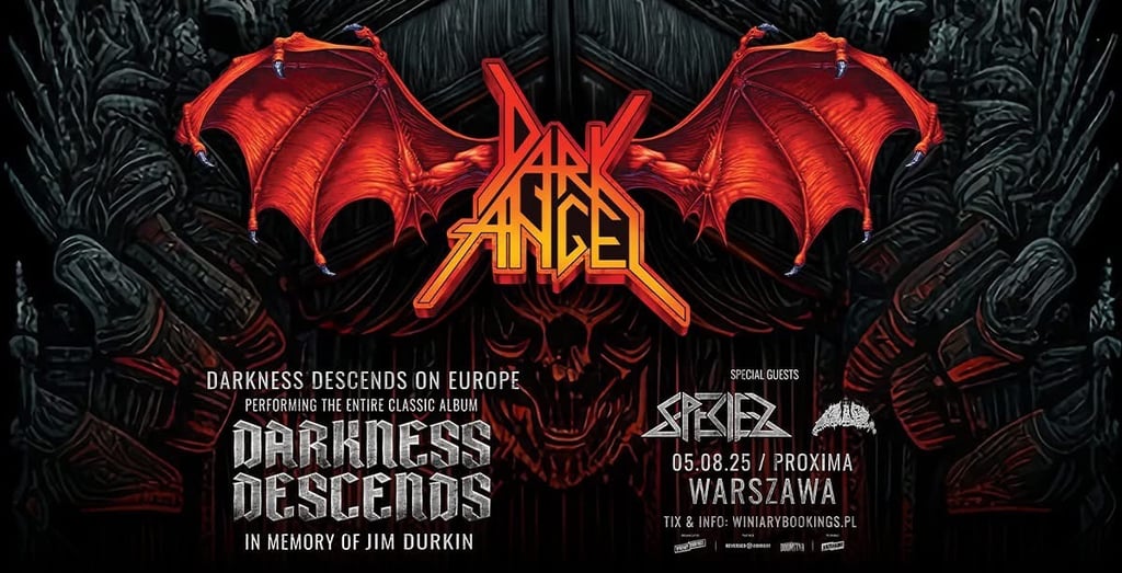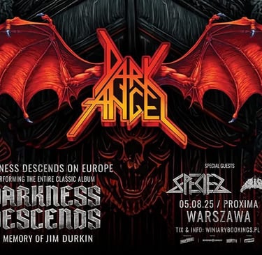 A thrash metal legend for 2 concerts in Poland! Dark Angel will perform their cult album “Darkness Descends” in its entirety, new songs from the upcoming “Extinction Level Event,” and other hits from their catalog on August 4th at Zaklęte Rewiry in Wrocław and the next day at Proxima in Warsaw. They will be accompanied by Species at both concerts, while the evenings in Wrocław and Warsaw will be opened by Leprozorium and R.I.P. respectively.