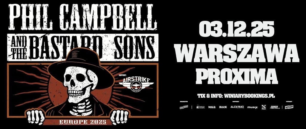 Motörhead guitarist Phil Campbell, known for over 30 years with the legendary band, is returning to Poland! Along with his sons and vocalist Joel Peters, as Phil Campbell and The Bastard Sons, they will play two concerts: on December 2nd at Club 2Progi in Poznań, and on December 3rd at Proxima in Warsaw, to jointly celebrate Motörhead's 50th anniversary! The German band Airstrike will perform as support.